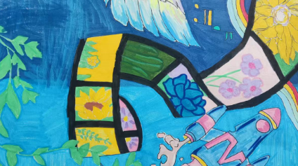 這幅作品以地球為核心意象,用多彩畫筆勾勒出世界的多元與美好。不同膚色的孩子攜手嬉戲,和平鴿、和平標(biāo)志傳遞和平愿景,各國元素與絢爛花朵交織,寓意全球孩童共筑和平、友愛、多彩的地球家園,展現(xiàn)對世界大同的純真向往 。